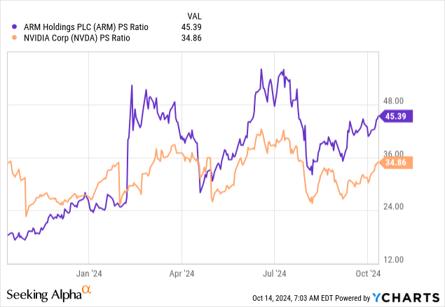 然而,ARM投资者为这种增长付出的溢价是巨大的,与Nvidia相比甚至更高。例如,后者的市销率要低得多,为35倍,而ARM的市销率为45倍。