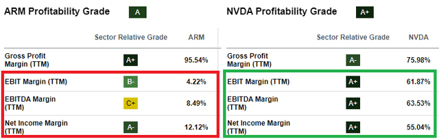 由于ARM的销售额由特许权使用费和被许可人代表,因此其毛利率对于投资者而言并不是一个相关指标。然而,如果我们将营业利润率和净利润率与英伟达进行比较,那么对于ARM投资者来说,情况看起来更糟。所有这些都假设英伟达目前的怪异估值一开始是合理的。