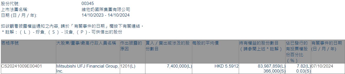 香港联交所最新资料显示,10月7日,三菱日联金融集团减持维他奶国际(00345)740万股,每股作价5.5912港元,总金额约4137.49万港元。减持后最新持股数目约8398.79万股,最新持股比例7.82%。