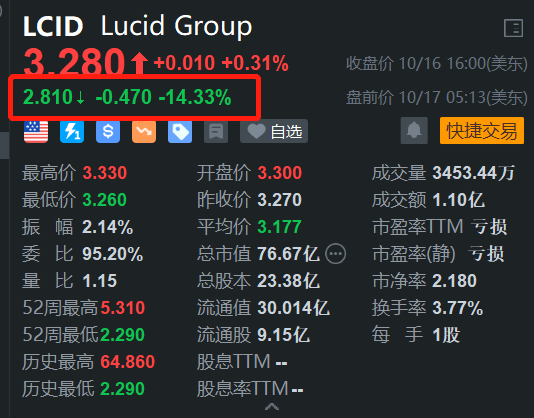 格隆汇10月17日|美国电动汽车公司Lucid Motors(LCID.US)盘前大幅下超14%。消息上,该公司预计第三季度亏损为7,6500万至7,9000万美元,而去年同期报告的亏损为6,3090万美元。在上一季度,该公司报告亏损为6,4340万美元。该公司还表示,第三季度生产和交付的汽车数量少于第二季度。(格隆汇)