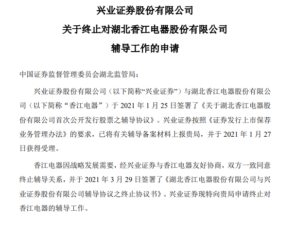 次年1月,香江电器又与兴业证券签署了上市辅导协议。但仅过了两个月,香江电器与兴业证券终止了辅导进程。对于此次终止委聘,香江电器表示是因为兴业证券未能遵守协定的上市时间表。