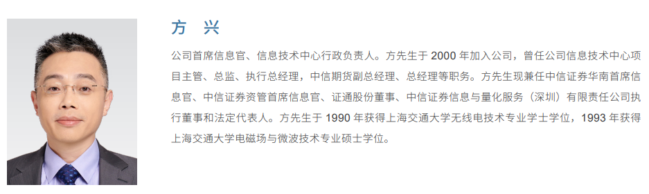 履历显示,方兴于1990年获得上海交通大学无线电技术专业学士学位,1993年获得上海交通大学电磁场与微波技术专业硕士学位。他于2000年加入中信证券,历任信息技术中心项目主管、总监、执行总经理,中信期货副总经理、总经理等职务。目前他担任首席信息官、信息技术中心行政负责人。兼任中信华南首席信息官、中信资管首席信息官、证通股份董事、中信信息与量化服务执行董事和法定代表人。