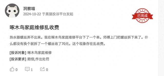 在黑猫投诉 【下载黑猫投诉客户端】平台,关于啄木鸟家庭维修的投诉屡见不鲜。消费者反映的主要问题集中在“维修价格虚高”“巧立名目乱收费”“维修效果不理想”等方面。