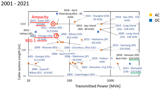 德国AmpaCity项目。2011年9月项目启动,投资1350万欧元,由德国莱茵集团牵头,Nexans负责 电缆、终端和配套限流器设计制作。电缆为Bi2223材料,参数为1km、10kV/40MVA,于2013年3月在德国埃森市区开始铺设,连接市内Dellbrügge和Herkules两个变电站。2014年3月,成功接入电网并投入商业化运行。该超导电缆是功率是铜电缆的6倍,同时由于额定电压10kV小于铜电缆的110kV,取消多做高压变电站。