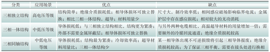 目前最常见的冷绝缘交流超导电缆按照三相通流导体的结构形式可分为三种结构:三相独立结构、三 相一体结构和三相同轴结构,分别适用于高(>220kV)、中低(35~110kV)、低(10~35kV)电压的应用场景。这三种结构来自于国外产品, 中国还未出台类似的结构标准。三相独立结构超导电缆的三相导体分别 位于不同的低温恒温器中。三相一体(或称三相相容)结构超导电缆的三相导体排列如品字形。三相同轴 结构超导电缆的三相导体相互嵌套。三相一体和三相同轴结构的导体均位于同一个低温恒温器中。三种结 构需要根据应用场景进行选择。针对配电网的应用需求,三相一体器和三相同轴型的超导电缆较为合适。