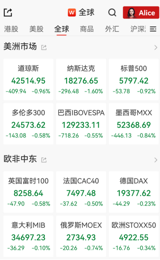 标准普尔500指数下跌0.92%,收于5,797.42点。道指下挫409.94点,收于42,514.95点,跌幅0.96%。这是蓝筹股指数自9月初以来表现最差的一天。纳斯达克综合指数下跌1.6%,收于18,276.65点。
