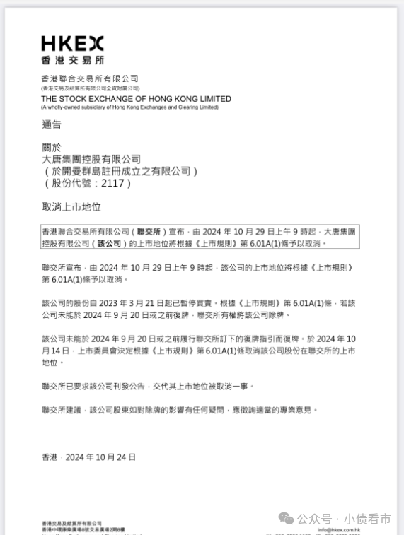 公告显示,退市是因为大唐集团控股和大发地产,未能在18个月的停牌期限内完成财务业绩发布、解除清盘令等复牌指引,因此港交所上市委员会决定取消其上市地位。
