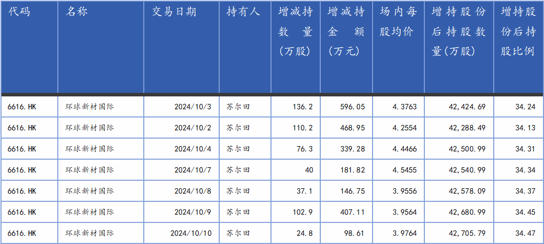在本轮股东增持潮中,环球新材国际(06616)的连续增持举措或值得关注。根据wind数据统计,公司实控人苏尔田于10月2日至10月10日期间数次增持公司股票,累计增持股票数量达到527.5万股,累计增持金额达到2238.6万港元。增持完成后,苏尔田的累计持股比例上升至34.47%,持续位居公司股东首位。
