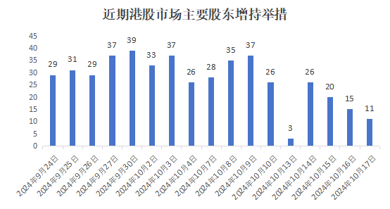 根据wind数据显示,9月24日至10月21日期间,共有202家港股上市公司的股东进行了增持举措,共计进行了462次增持操作。从时间段来看,截至10月9日为止,市场中的增持热情均非常高涨,诸多资金主动涌入港股市场,也为恒生指数的上行提供了动力。10月10日往后的交易日中,市场增持的热度有所下降。