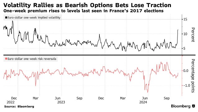 容易受到特朗普获胜可能带来的贸易关税的影响的欧元的波动性已出现2020 年以来的最大涨幅,目前处于 2023 年 3 月以来的最高水平。所谓的风险逆转(衡量买入而非卖出货币期权的兴趣的指标)显示,交易员仍然看跌欧元,尽管最近几天随着现货市场欧元的反弹,短期走势的定位变得更加积极。