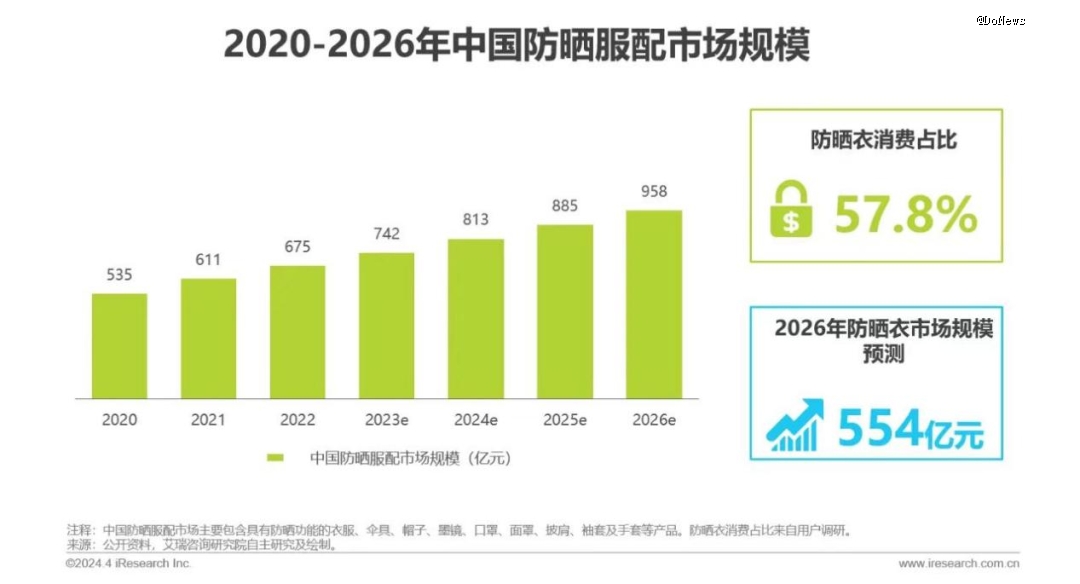 据艾瑞咨询所发布的《中国防晒衣行业标准白皮书》数据,2023年蕉下在我国防晒衣市场的占有率*,高达26.5%,预计到2026年防晒衣市场规模将会达到554亿。