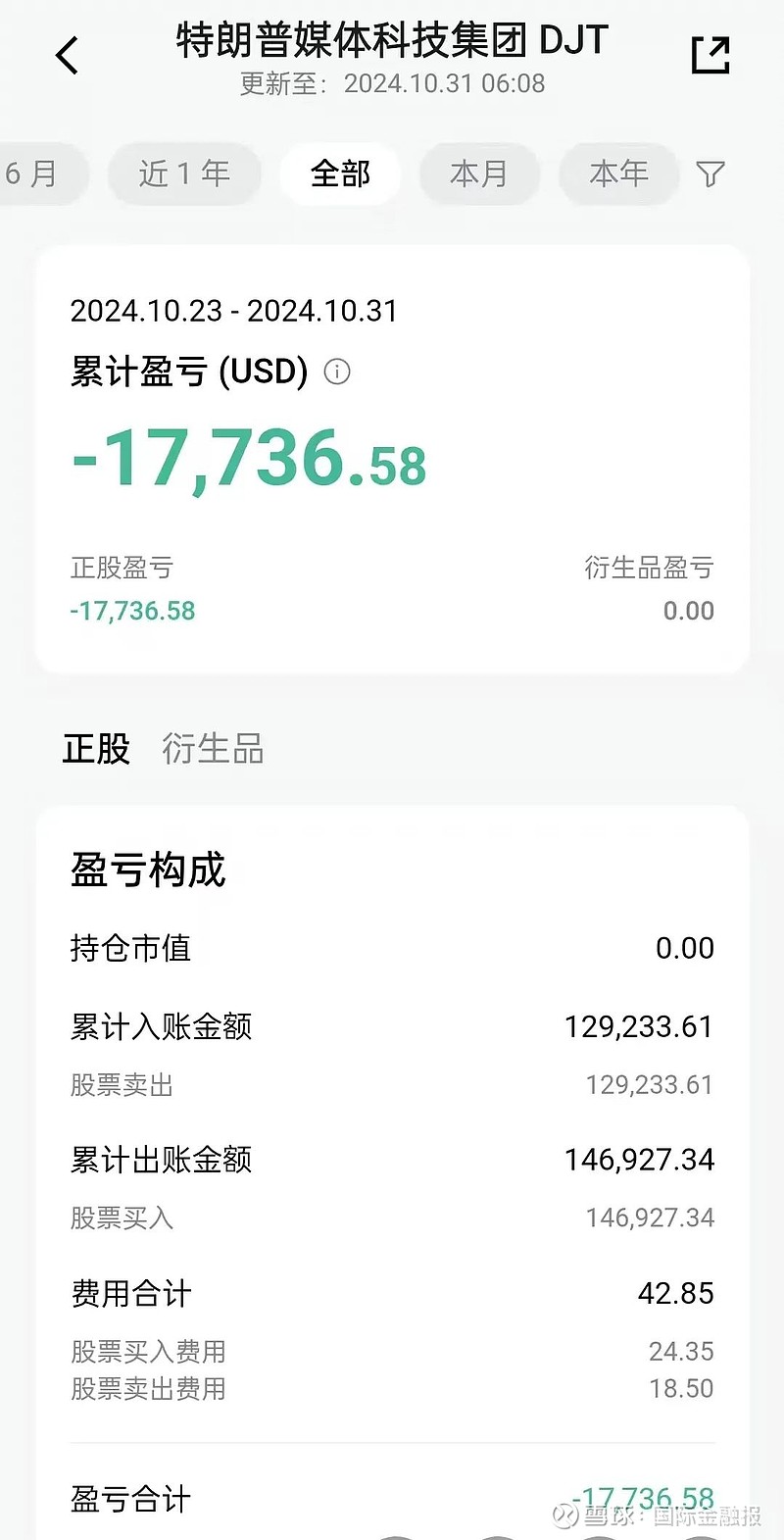 “我记得特别清楚,第一次买入DJT这只股票的时候,是10月23日,我是33美元买入的,当时投了3万美元进去,本来就想试一下,能赚一点就很满足了”,投资者小艾向记者回忆道,买入后第二天的盘前,股票一直在跌,几乎是几秒钟就有1000元(人民币)区间的波动,“那天晚上心情特别糟糕,索性就卸载了软件”。
