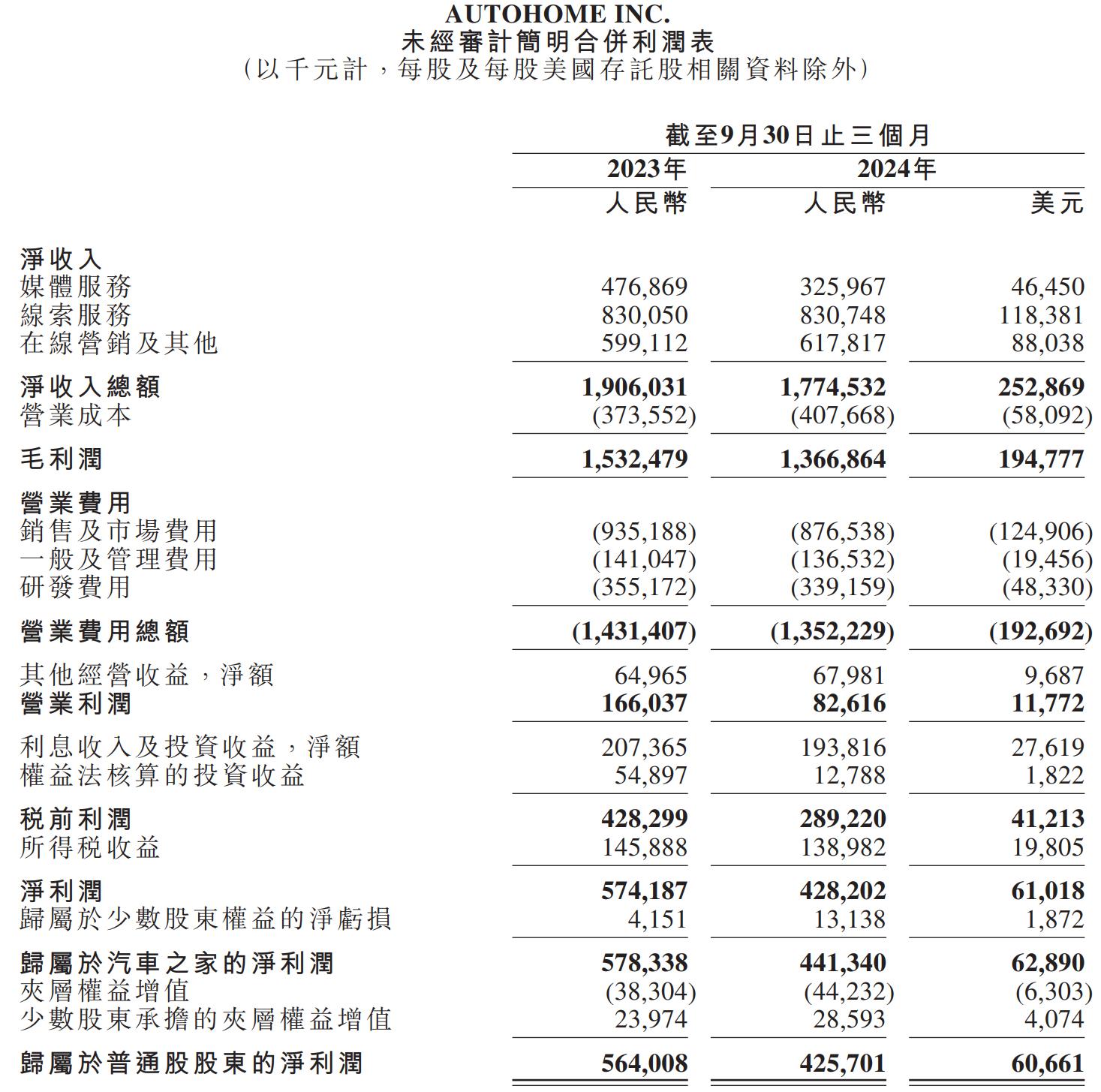 汽车之家2024年第三季度归属于汽车之家的净利润为4.4亿元(6290万美元),较2023年同期的5.78亿元下降23.9%。