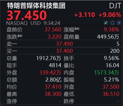 22:30 美股小幅高开特朗普媒体科技集团涨超9%
