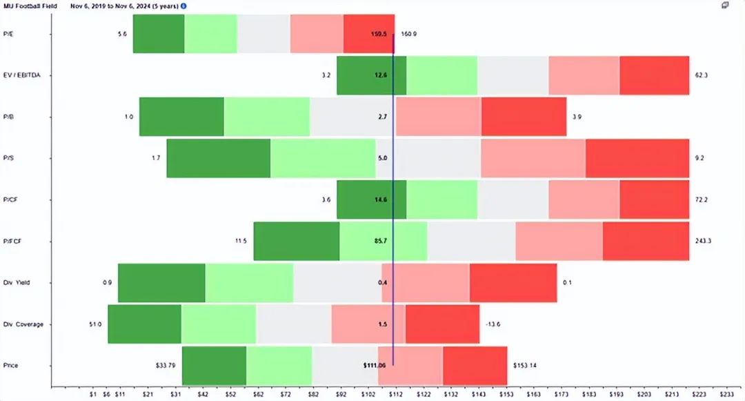 快速浏览一下下面的图表,就会发现一些估值比率,如 EV/EBITDA 和 P/CF 接近 5 年最低值。而其他一些比率,如 P/E 和 P/B,则更接近其 5 年最高值范围。