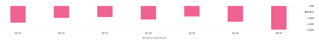 此外,该公司的大多数公开交易债券(这是其中之一)看起来相当有吸引力。再来看看现金流量表,我对公司过去两个季度的正自由现金流感到非常鼓舞。今年第一季度是该公司自 2022 年 6 月以来首次实现正自由现金流。如果我们仔细观察资本支出,我们会发现自24财年第二季度以来资本支出急剧增加。