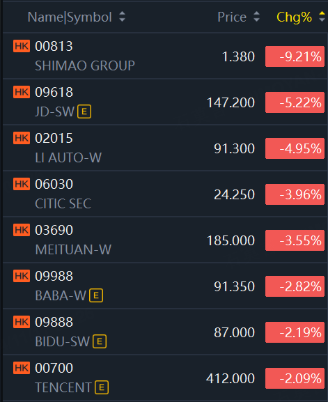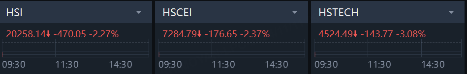 The Hong Kong stock opened with significant declines. The Hang Seng Index fell by 2.27%, the Hang Seng China Enterprises Index dropped by 2.37%, the Hang Seng Tech Index decreased by 3.08%.