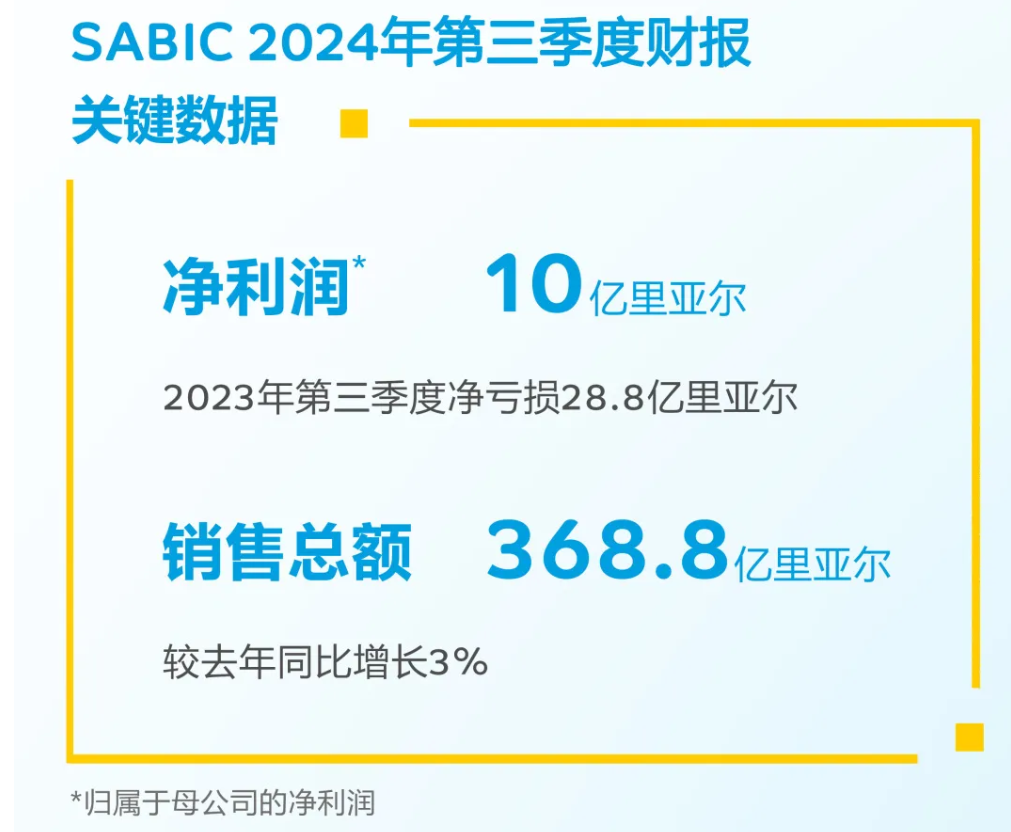 SABIC2024年第三季度实现销售总额368.8亿里亚尔(约98.2亿美元),同比增长3%;