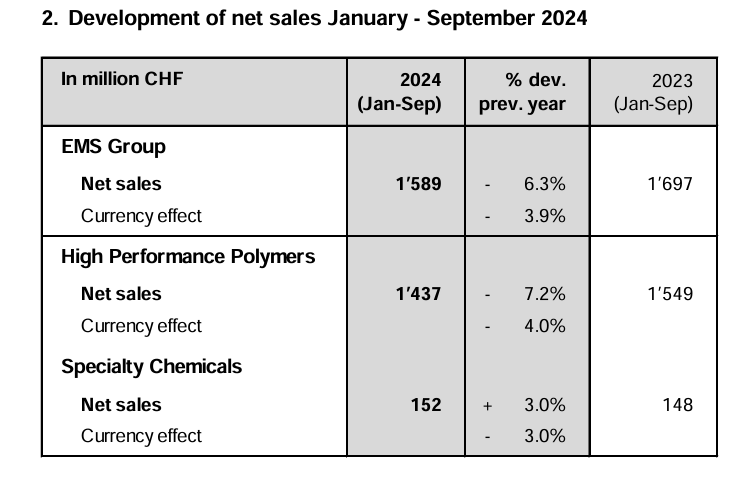 EMS集团主要活跃于高性能聚合物和特种化学品业务领域,其旗下公司合并为 EMS-CHEMIE HOLDING AG,2024年前九个月的净销售额为15.89亿瑞士法郎(约18.15亿美元),同比下降6.3%。第三季度净营业收入(EBIT)则显著高于去年同期。