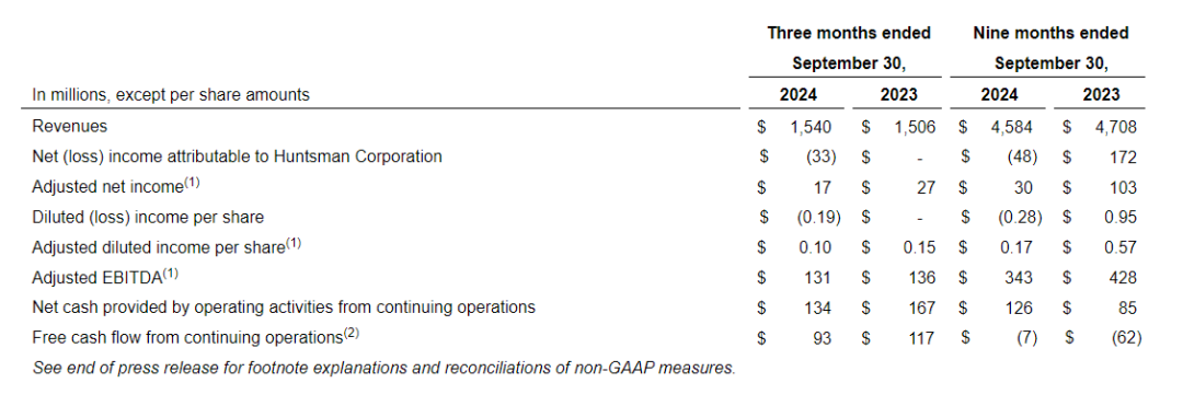 亨斯迈2024年第三季度实现营收15.4亿美元,同比增长2.3%;