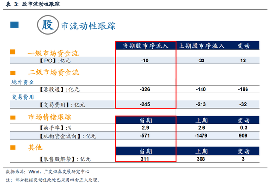 流动性:本周换手率持续攀升,机构资金流出加剧。根据wind数据,一级市场方面,本周IPO规模为10亿元,前一周IPO规模为23亿元。二级市场方面,截止本周四南下资金净流入326亿元,上周净流入140亿元,交易费用245亿元。投资者情绪方面,本周日度平均换手率为2.89%,前一周为2.60%;机构资金流出571亿元,前一周流出1479亿元。本周限售股解禁311亿元,前一周限售股解禁308亿元,预计下周限售股解禁505亿元。