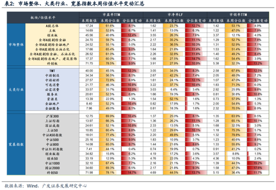 市场整体来看,本周A股总体估值扩张,A股剔除金融估值扩张。其中,创业板扩张幅度最大。大类行业来看,本周行业估值全部扩张,其中,TMT、必需消费、可选消费估值扩张幅度较大。宽基指数看,本周指数全部估值扩张,其中,科创50、深圳成指、沪深300扩张幅度较大。