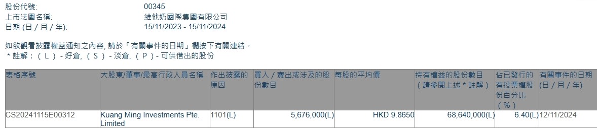 据香港联交所最新数据显示,11月12日,Kuang Ming Investments Pte. Limited增持维他奶国际(00345)567.6万股,每股作价9.865港元,总金额约5599.37万港元。增持后最新持股数目为6864万股,持股比例为6.4%。