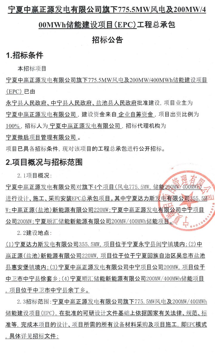 招标范围:宁夏中赢正源发电有限公司旗下775.5MW风电及200MW/400MWh储能建设项目(EPC),在批准的可研设计文件基础上依据国家有关法律、规范、标准等,完成本项目的设计、项目所需的所有设备材料采购及项目施工,即EPC模式。