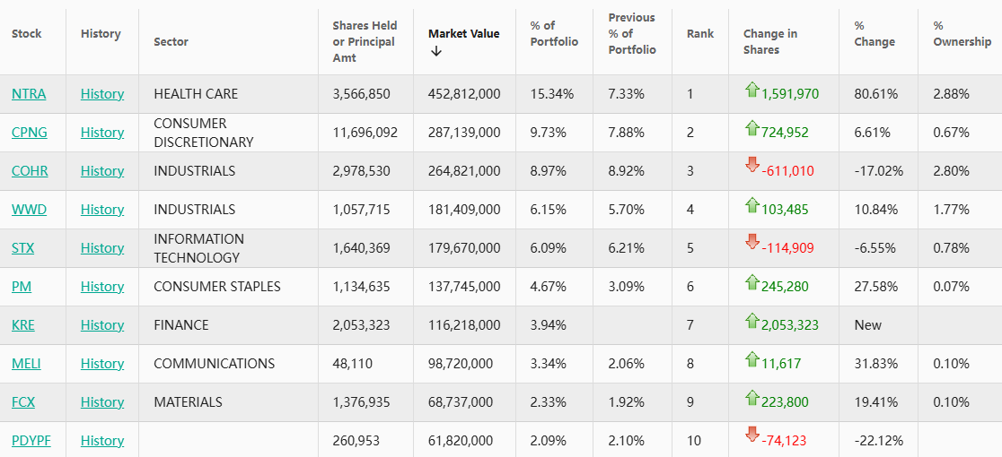 Coherent(COHR.US)位列第三,持仓298万股,持仓市值约2.65亿美元,占投资组合比例为8.97%,较上季度持仓数量下降17.02%。