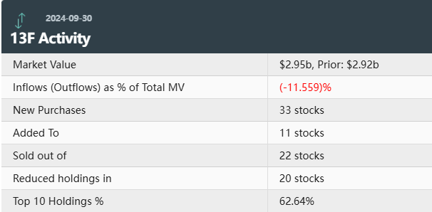 据统计,该机构第三季度持仓总市值为29.5亿美元,上一季度总市值为29.2亿美元。该基金在第三季度的投资组合中新增了33只个股,增持了11只个股,减持了20只个股,清仓了22只个股。其中前十大持仓标的占总市值的62.64%。