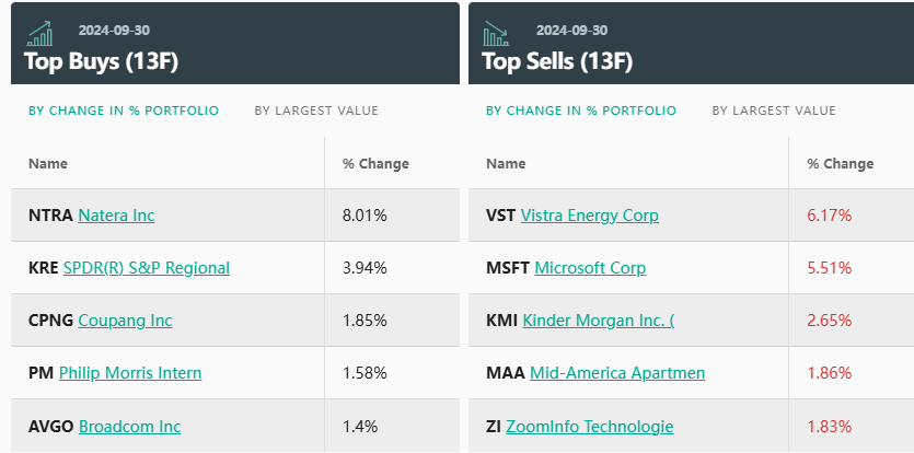 前五大卖出标的包括:Vistra Energy(VST.US)、微软(MSFT.US)、Kinder Morgan、MAA房产信托(MAA.US)、ZoomInfo Technologies。