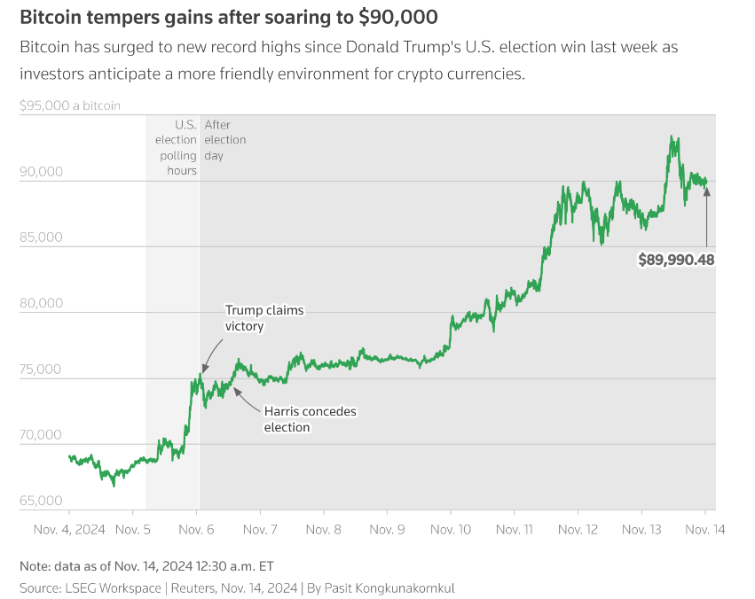 交易价格方面,比特币价格今年已翻了一番,自11月5日美国大选以来已上涨约30%,达到9万美元。而规模较小的加密货币以太坊等,自大选投票以来也在大幅上涨,以太坊自那以来已上涨约33%,达到3220美元。“meme加密货币”狗狗币(Dogecoin),一种由兼具全球首富、特斯拉CEO、特朗普核心盟友等多个头衔的马斯克推广的另类且价格波动幅度极大的加密货币,则已上涨140%。