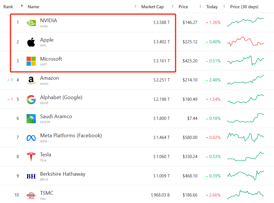 按照已经触及的3.2万亿美元的总计市值来对比,加密货币市场的市值已经超越美国七大科技巨头之一的微软(MSFT.US)。截至周三美股收盘,最新市值显示微软总市值约为3.16亿美元。3.2万亿美元总市值,在全球股票榜单中,则仅次于英伟达(NVDA.US)与苹果(AAPL.US)这两大“超级巨无霸”,意味着将加密货币市场视作一只股票的话,其市值仅次于英伟达与苹果,遥遥领先于亚马逊、谷歌、Meta以及沙特阿美等一众全球最顶级上市公司。