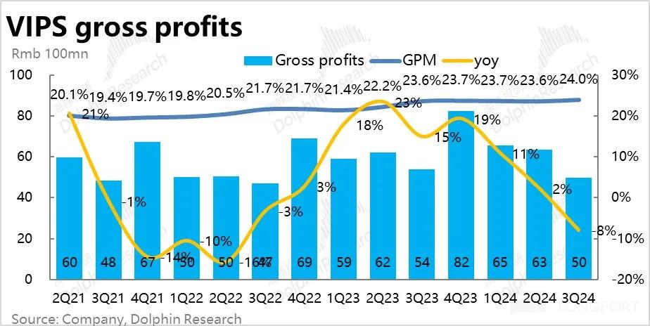 存粹从唯品会本季的业绩角度,表现无疑是比较差的。在宏观和行业竞争的双重打击下,用户流失导致成交体量下滑,进而传导到收入和利润双双 10% 的下降,即便靠控制费用也不足以对冲。且对下季度的收入继续下跌的指引,体现出了 4Q 有类似幅度的业绩压力。