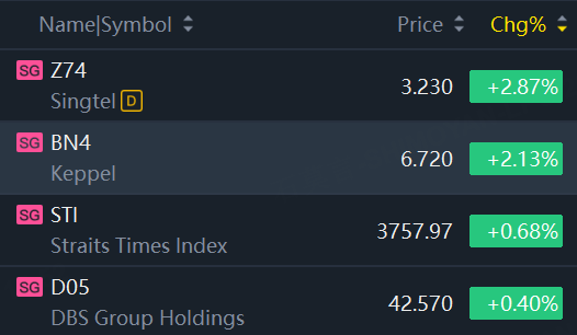 The Straits Times Index (STI), a key benchmark for the Singapore Exchange, ranged between 3,738.42 and 3,766.93 throughout the day. It ended the session at 3,757.97, up 25.42 points or 0.68% compared to Friday's close.