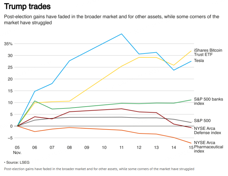 Of course, some so-called Trump trades are still sporting huge gains. Shares of Tesla TSLA.O, which have risen on bets that Musk’s close association with the president-elect will benefit the company, are up 28% since Election Day.