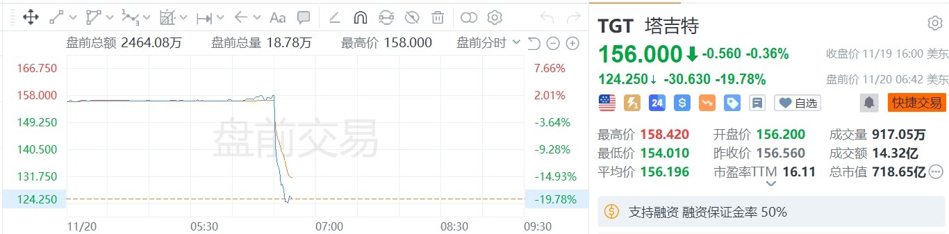 格隆汇11月20日|塔吉特(TGT.US)盘前跌近20%。塔吉特三季度销售额252.3亿美元,预估257.4亿美元。三季度调整后每股收益1.85美元,预估2.3美元。塔吉特预计全财年调整后每股收益8.3-8.9美元,此前预计9-9.7美元,市场预估9.57美元。塔吉特预计第四季度调整后每股收益1.85-2.45美元,市场预估2.65美元