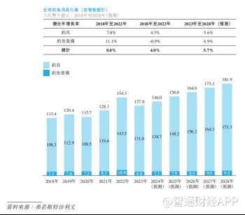 中国钓鱼装备市场方面,按零售额计算,市场规模由2018年的13亿元增长至2023年的人14亿元,复合年增长率为1.5%。预期中国钓鱼用具行业市场规模将于2023年至2028年继续以8.4%的复合年增长率增长至21亿元。