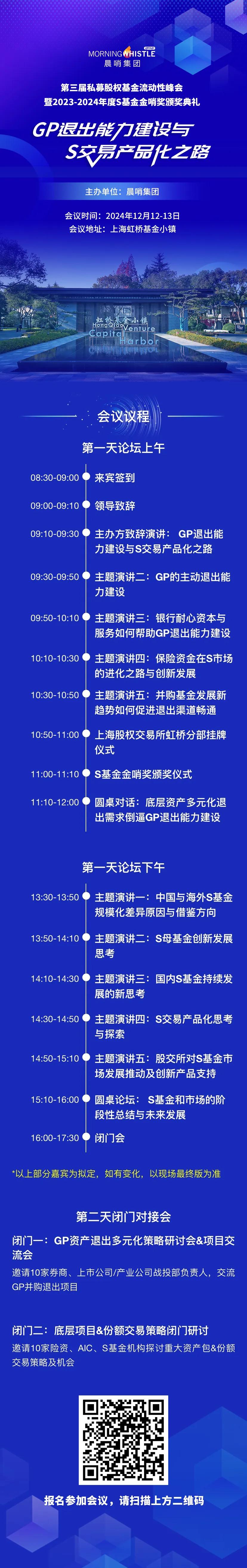 今年12月,晨哨将举办“第三届私募股权基金流动性峰会”,并揭晓“2023-2024年度S基金金哨奖”系列的获奖榜单。过去,晨哨的“私募股权基金流动性峰会”主要聚焦S市场,但今年的“第三届私募股权基金流动性峰会”将首次引入并购基金市场中的领军机构,助力私募股权市场的退出面向多元化发展,真正与成熟的美元基金市场进行接轨和对标。