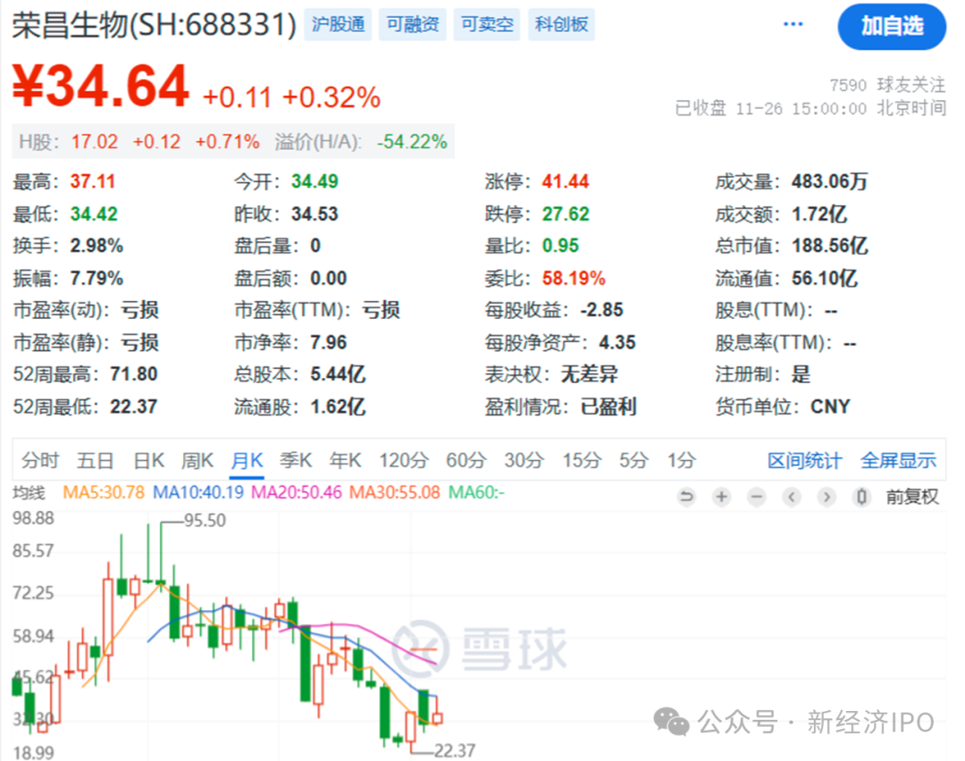 但是,不断融资的荣昌生物业绩并不佳。据界面新闻报道,荣昌生物自2020年至今,除2021年勉强盈利外,其余三年均为亏损状态,扣非净利累计亏损总额已超30亿元。也就是说,登陆科创板2年时间已经将募资资金消耗完毕。今年1月,荣昌生物一度陷入资金链紧张风波,虽然公司快速发公告辟谣,但3月份,荣昌生物突然抛出一份25.5亿元的定增计划,似乎坐实了公司现金紧张的传闻。7月下旬,荣昌生物宣布缩减定增规模,将拟募资额从不超25.5亿元调整至不超19.53亿元。自披露定增计划以来,荣昌生物股价从64元一路下跌至22元左右,累计跌幅达65%。在9月末的这轮大反弹中,荣昌生物表现不佳,目前股价34.64元,相比3月份价格仍然下跌45%。