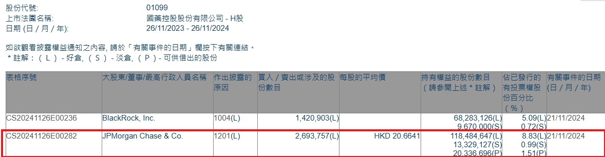 摩根大通减持国药控股(01099)约269.38万股 每股作价约20.66港元