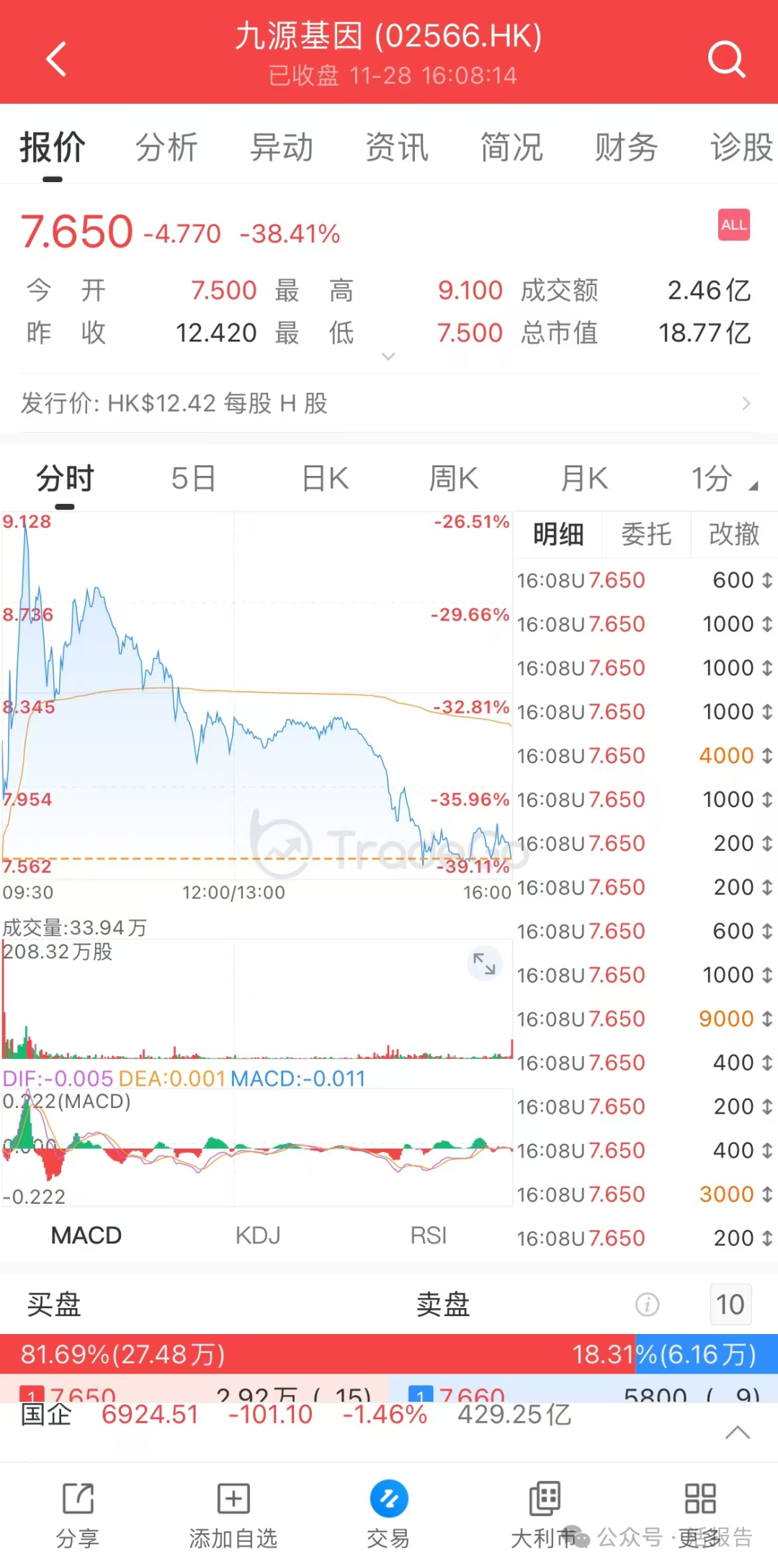 上市首日,公司股价大幅低开,较发行价跌近40%,开盘后一小时跌幅逐渐收窄,但随后再度走弱,收盘跌38.41%,报7.65港元,最新市值18.77亿港元。全天成交2895.44万股,成交额约2.46亿港元,换手率26.54%。