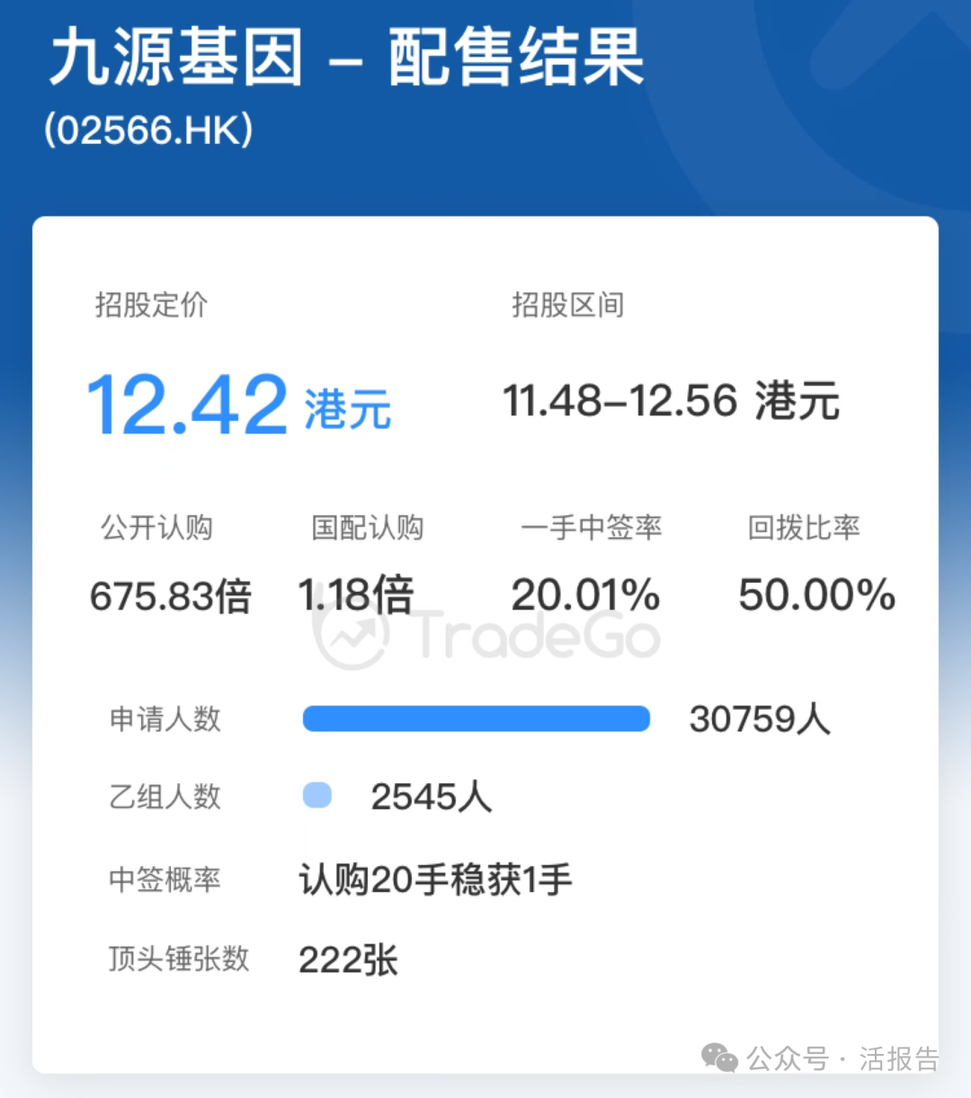配售结果方面,本次申购人数共30759人,其中乙组2545人,顶头槌222张;公开认购倍数为675.83倍,国配认购倍数为1.18倍;回拨50%,一手中签率20.01%。