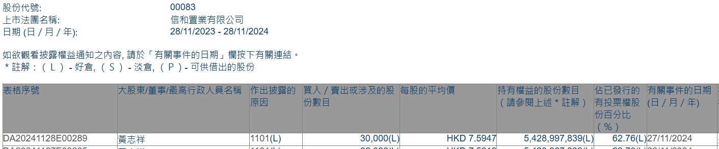 香港联交所最新资料显示,11月27日,董事会主席黄志祥增持信和置业(00083)3万股,平均每股作价为7.5947港元,总金额约为22.78万港元。增持后最新持股数目约为54.29亿股,最新持股比例为62.76%。