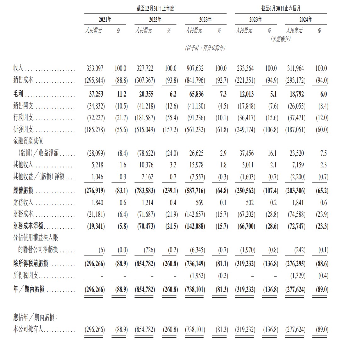 业绩方面,2021年、2022年、2023年、2024年截至6月30日止六个月,福瑞泰克收入分别约为3.33亿元、3.28亿元、9.08亿元、3.12亿元人民币。同期,该公司年内亏损分别约为2.96亿元、8.55亿元、7.38亿元、2.78亿元人民币。
