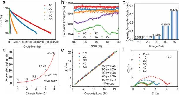 图2:在45℃下以1 C至5 C的充电速率测试的LiFePO4/石墨电池,随后以1 C的恒定放电速率放电的电化学性能。(a) 循环性能。(b) 库仑效率。(c) 每周期平均容量衰减。(d) 以y = e(x−1.124)拟合的标准化加速老化率。(e) 根据GITT数据分析由于LLI导致的容量损失。(f) 在10℃下EIS的Nyquist谱图。