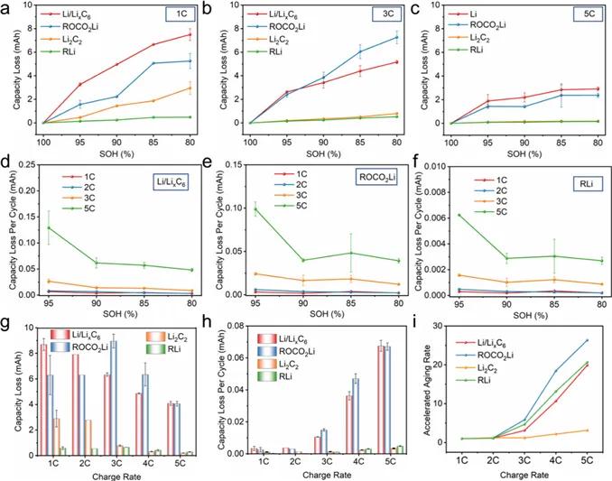 图3:使用MST定量分析石墨中不活跃锂的含量,减去了新鲜状态下的不活跃锂。所有数据均重复了两次。(a) 1 C,(b) 3 C和(c) 5 C循环样品中通过MST定量的不活跃锂含量。(d) 由于形成Li/LixC6,(e) ROCO2Li,(f) RLi导致的每周期平均容量损失。(g) 在80% SOH时不活跃锂的比较。(h) 在80% SOH时不同不活跃锂组分每周期的平均容量损失。(i) 不活跃锂的标准化加速老化率。