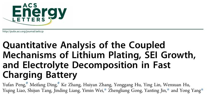 该成果以 "Quantitative Analysis of the Coupled Mechanisms of Lithium Plating, SEI Growth, and Electrolyte Decomposition in Fast Charging Battery" 为题发表在《ACS Energy Letters》期刊,第一作者是Peng Yufan、Ding Meifang。