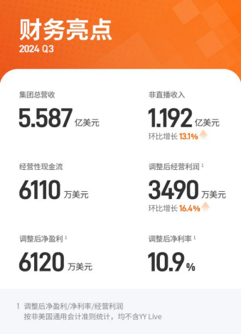 11月27日,欢聚集团发布2024年第三季度财报。第三季度,该集团收入5.587亿美元,BIGO板块收入4.96亿美元。在非美国通用会计准则下,该集团经营利润达3490万美元,环比增长16.4%,该集团净盈利达6120万美元,净利润率达10.9%。其中,在非美国通用会计准则下,欢聚集团BIGO板块经营利润达7290万美元,环比增长5%。该集团继续录得健康的正向经营现金流,达6110万美元。