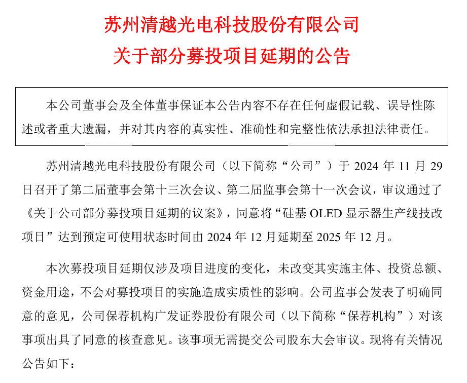 11月29日电清越科技发布关于部分募投项目延期的公告。公司决定将“硅基OLED显示器生产线技改项目”达到预定可使用状态的时间由2024年12月延期至2025年12月。此次延期仅涉及项目进度的变化,未改变实施主体、投资总额和资金用途,预计不会对募投项目的实施产生实质性影响。